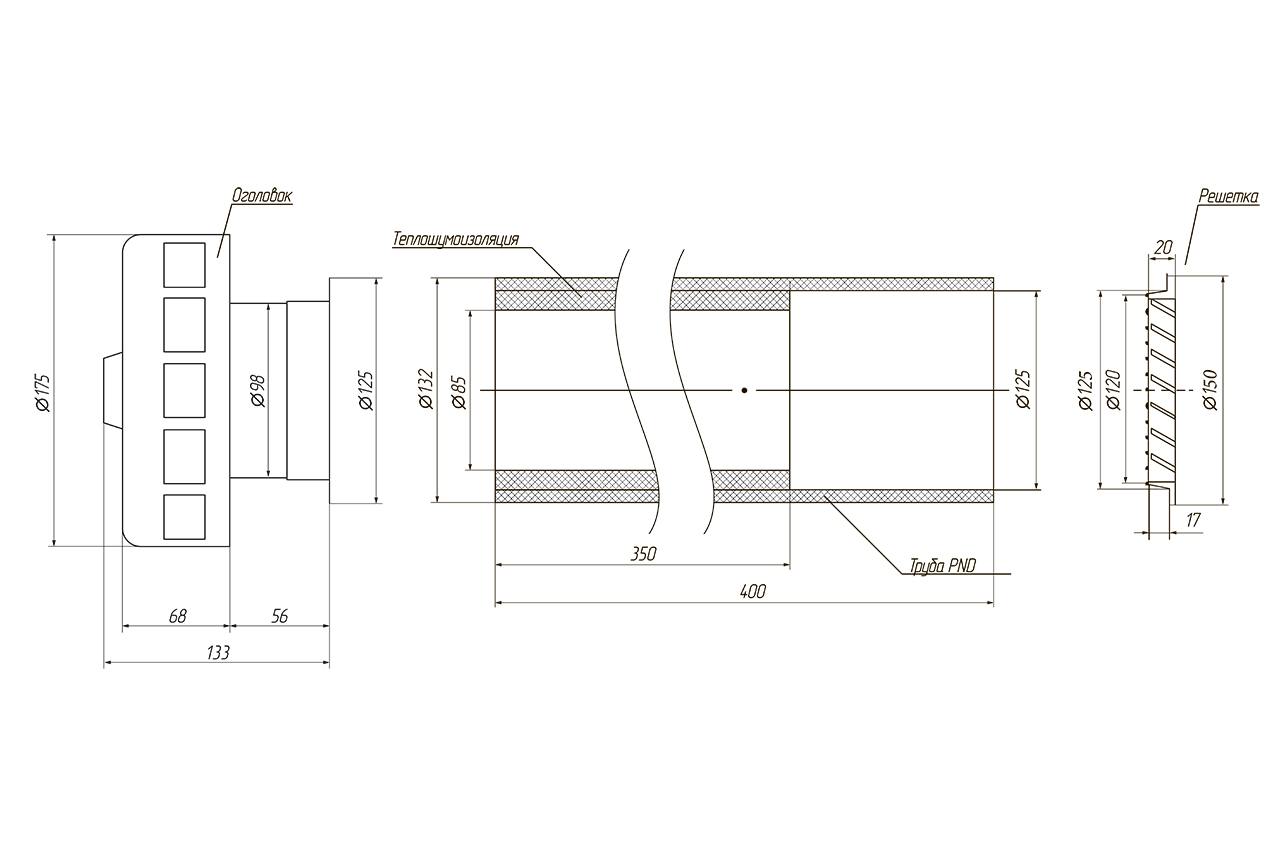 Пластиковый воздуховод - труба ПНД - необходим для поступления по нему воздуха через стену от наружной решетки к оголовку. Длина воздуховода - 400 мм. Канал может быть подрезан в зависимости от толщины стены, в которую он устанавливается. Внутри трубы расположена изоляция, которая выполняет 2 функции: