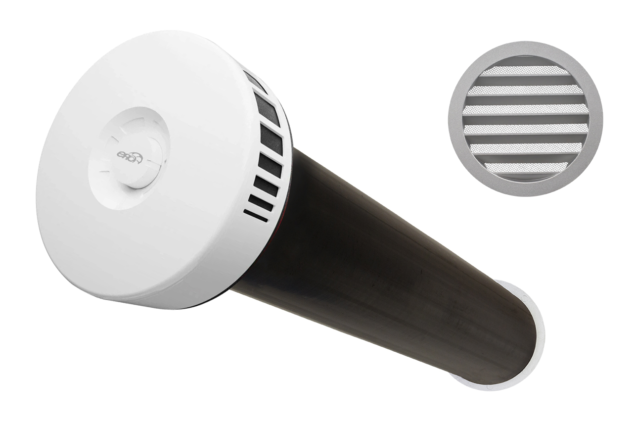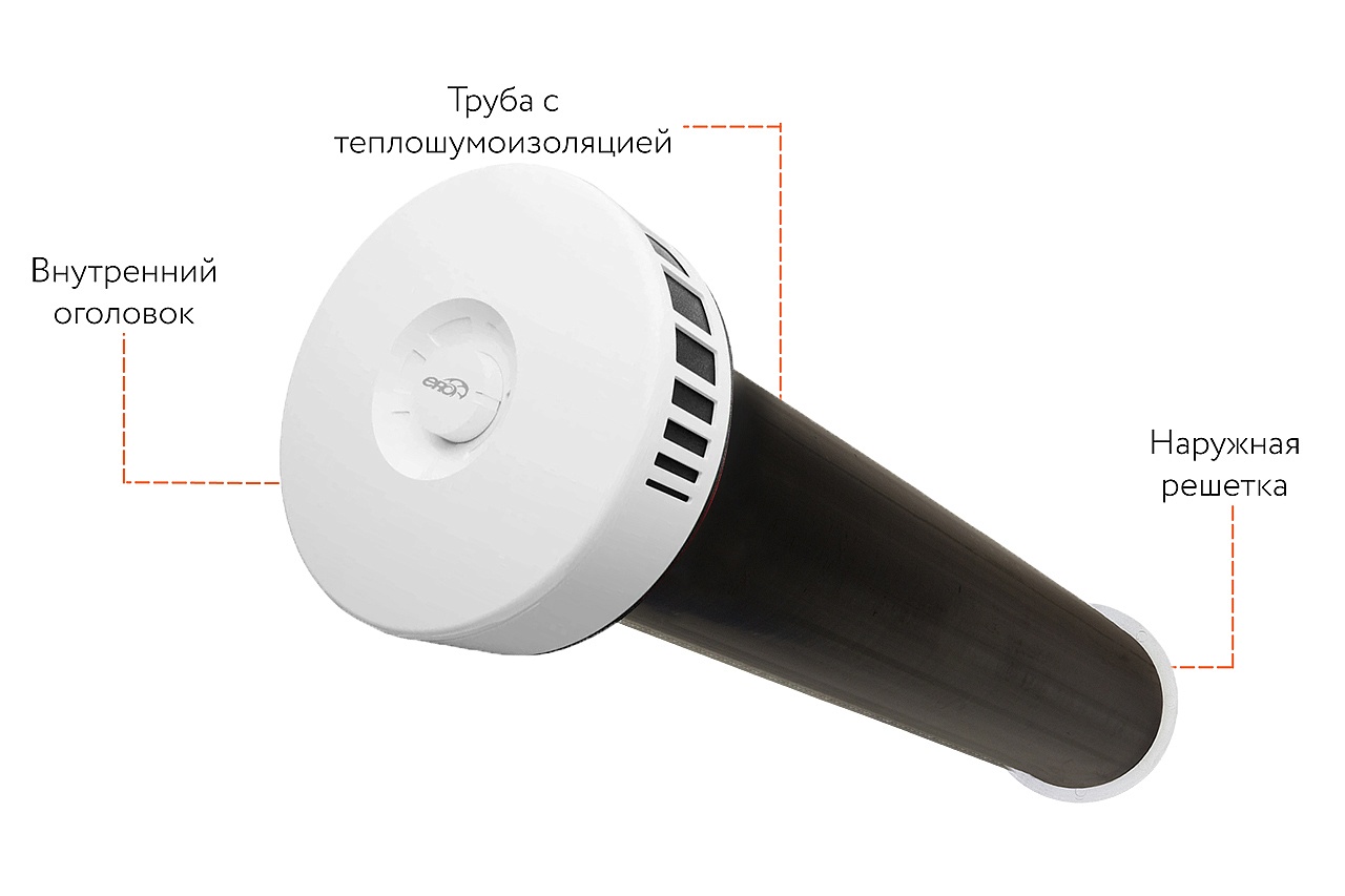 Пластиковый воздуховод - труба ПНД - необходим для поступления по нему воздуха через стену от наружной решетки к оголовку. Длина воздуховода - 400 мм. Канал может быть подрезан в зависимости от толщины стены, в которую он устанавливается. Внутри трубы расположена изоляция, которая выполняет 2 функции: