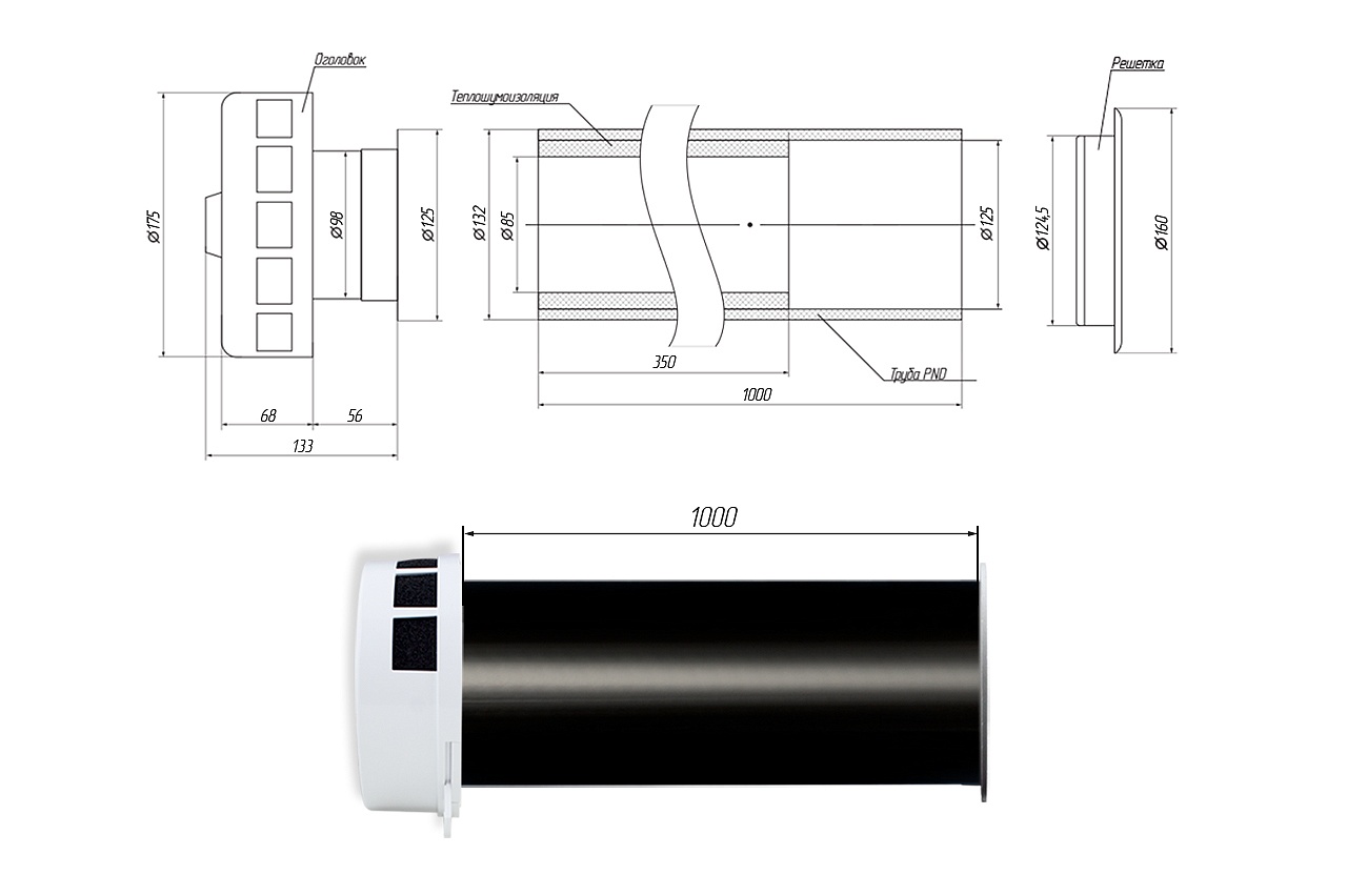 NovaPROF 1000 с серой пластиковой решеткой укомплектован воздуховодом - пластиковой трубой черного цвета с внутренним диаметром 125 мм, наружным диаметром 132 мм, длиной 1000 мм. Труба вставляется в стену в подготовленное отверстие диаметром 133 мм и со стороны улицы закрывается пластиковой решеткой. В трубу с внутренней стороны помещения укладывается теплошумоизоляция, а отверстие закрывается специальным шумотеплоизолированным оголовком белого цвета, изготовленным из ABS пластика, с воздушным фильтром и регулирующей поток приточного воздуха заслонкой. Регулировка потока воздуха осуществляется при помощи язычка снизу конструкции.