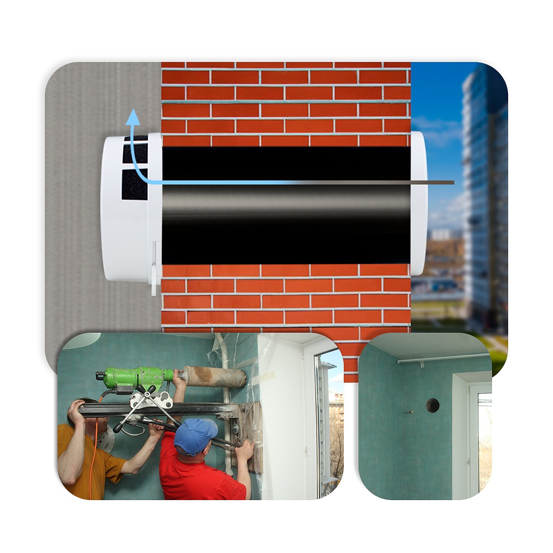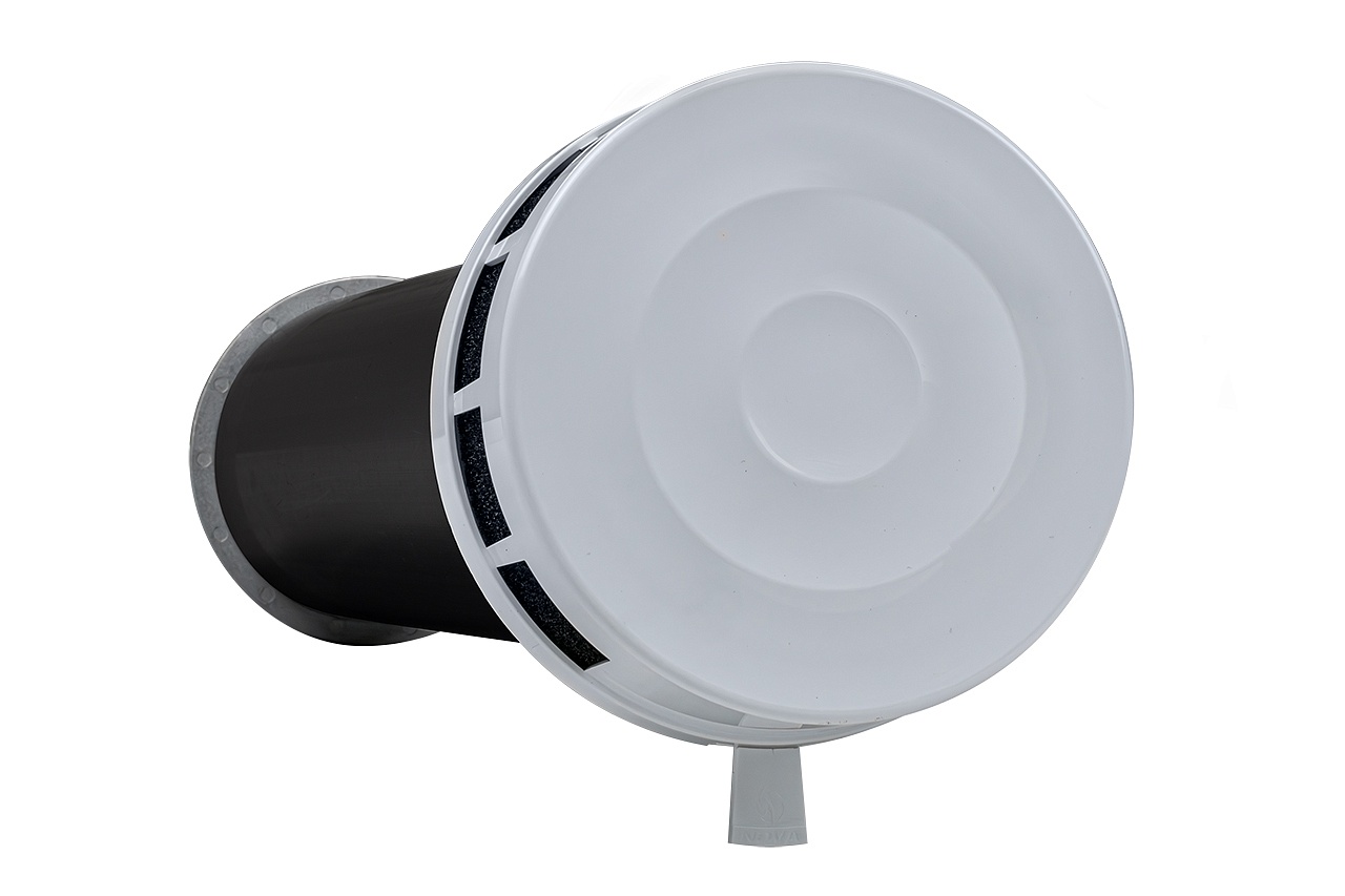 NovaPROF 400 с белой пластиковой решеткой укомплектован воздуховодом - пластиковой трубой черного цвета с внутренним диаметром 125 мм, наружным диаметром 132 мм, длиной 400 мм. Труба вставляется в стену в подготовленное отверстие диаметром 133 мм и со стороны улицы закрывается пластиковой решеткой. В трубу с внутренней стороны помещения укладывается теплошумоизоляция, а отверстие закрывается специальным шумотеплоизолированным оголовком белого цвета, изготовленным из ABS пластика, с воздушным фильтром и регулирующей поток приточного воздуха заслонкой. Регулировка потока воздуха осуществляется при помощи язычка снизу конструкции.
