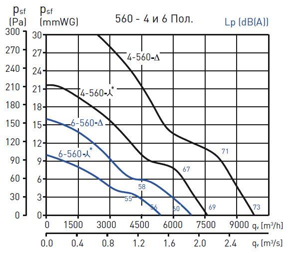 диаметр 560 мм, 6850/5400 м3/ч, 410 Вт, 58 дБа, 850 об/мин, 380 В 50 Гц