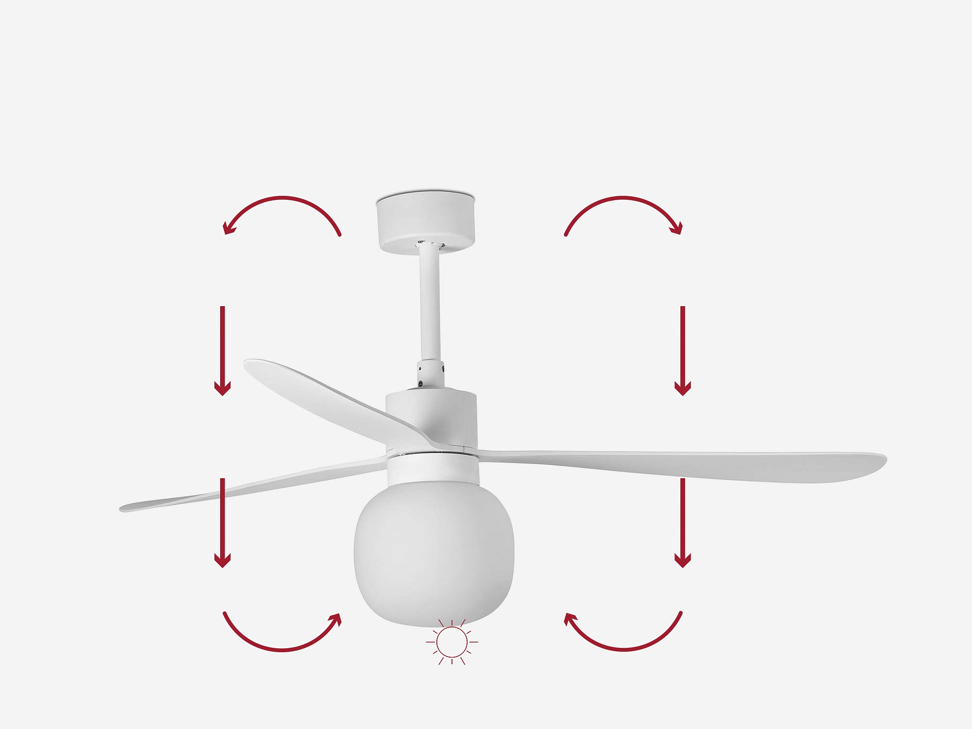 Переключатель реверса двигателя расположен на корпусе вентилятора, им пользователь может изменить направление вращения лопастей. Вращение лопастей «по часовой стрелке» обеспечивает процесс рекуперации тепла в помещении (рекомендуется применять в холодное время года), путем перемещения теплого воздуха от потолка вниз. Для этого данный переключатель нужно вручную переключить в верхнее положение. Вращение лопастей «против часовой стрелки» создает обратный эффект охлаждения воздуха в помещении. Для этого переключатель реверса нужно переключить в нижнее положение.