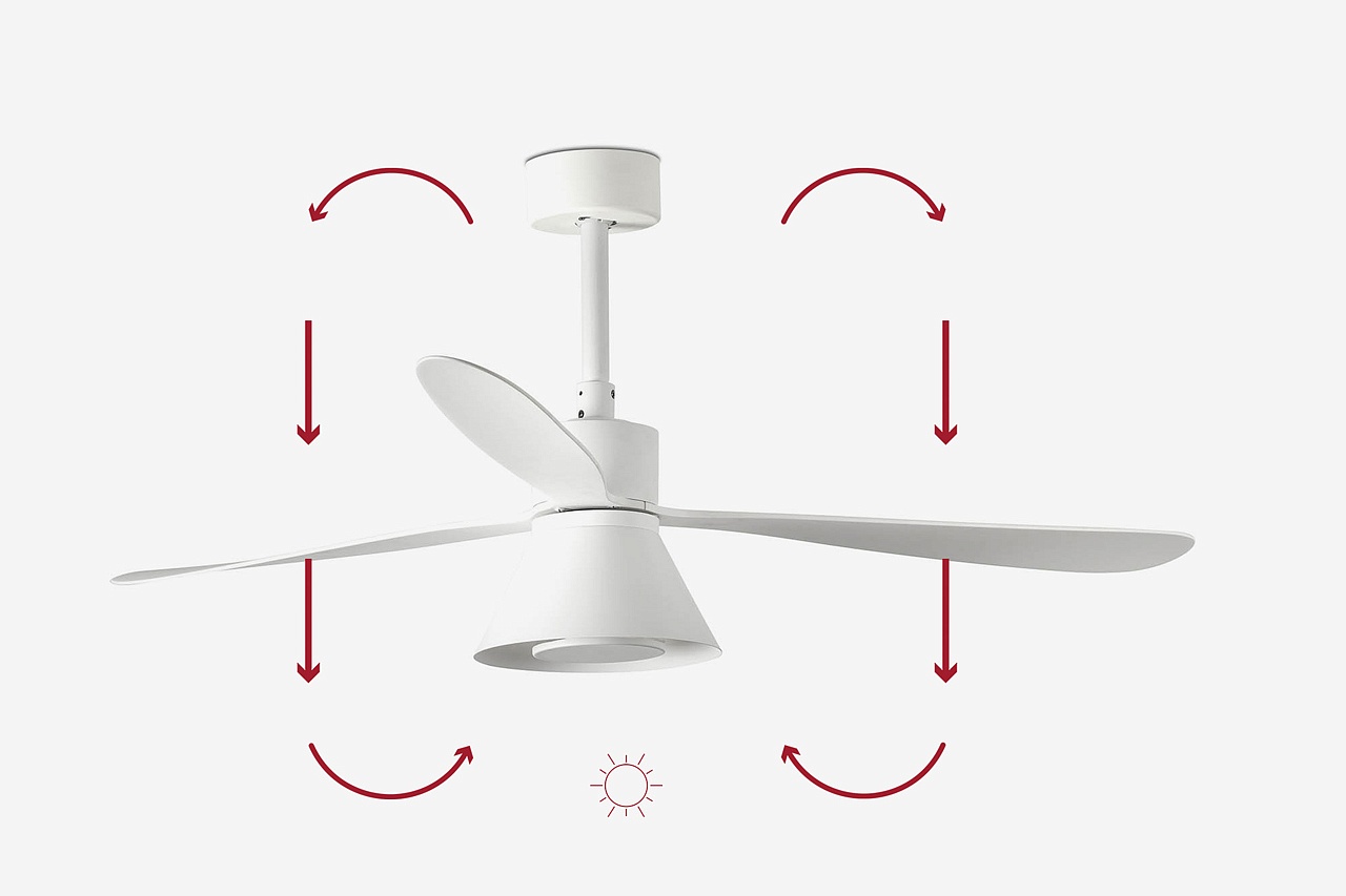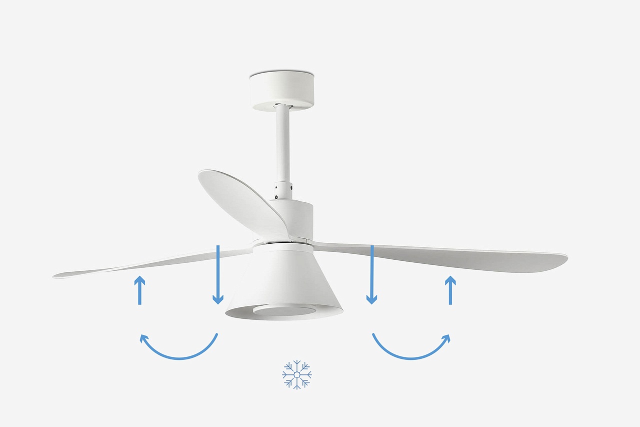 Вращение лопастей «по часовой стрелке» использует процесс рекуперации тепла в салоне (рекомендуется использовать в холодное время года), путем прохождения теплового воздуха от потолка вниз. Для этого переключателя необходимо вручную переключать в данном верхнем положении.