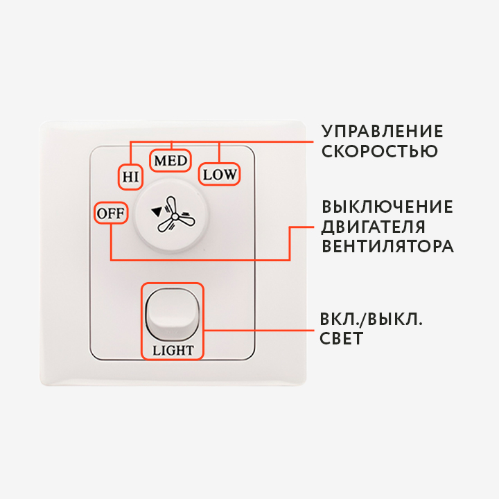 С помощью настенного регулятора скорости, входящего в комплект поставки, происходит управлением данным изделием. Регулятор состоит из лицевой панели, круглой поворотной ручки, с помощью которой можно выбирать одну из скоростей вращения вентилятора, а также выключать двигатель. Так же на лицевой панели расположена кнопка включения/выключения световой части вентилятора. Материал рамки и клавиш - высококачественный ABS пластик. Подсоединяемые провода фиксируются с помощью винтовых клемм на корпусе изделия.
