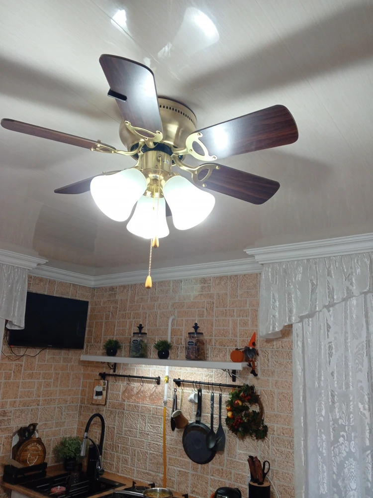 Красивая и хорошая люстра, вентилятор работает шикарно, смотрится шикарно. Собирается не сложно. Спасибо продавцу.