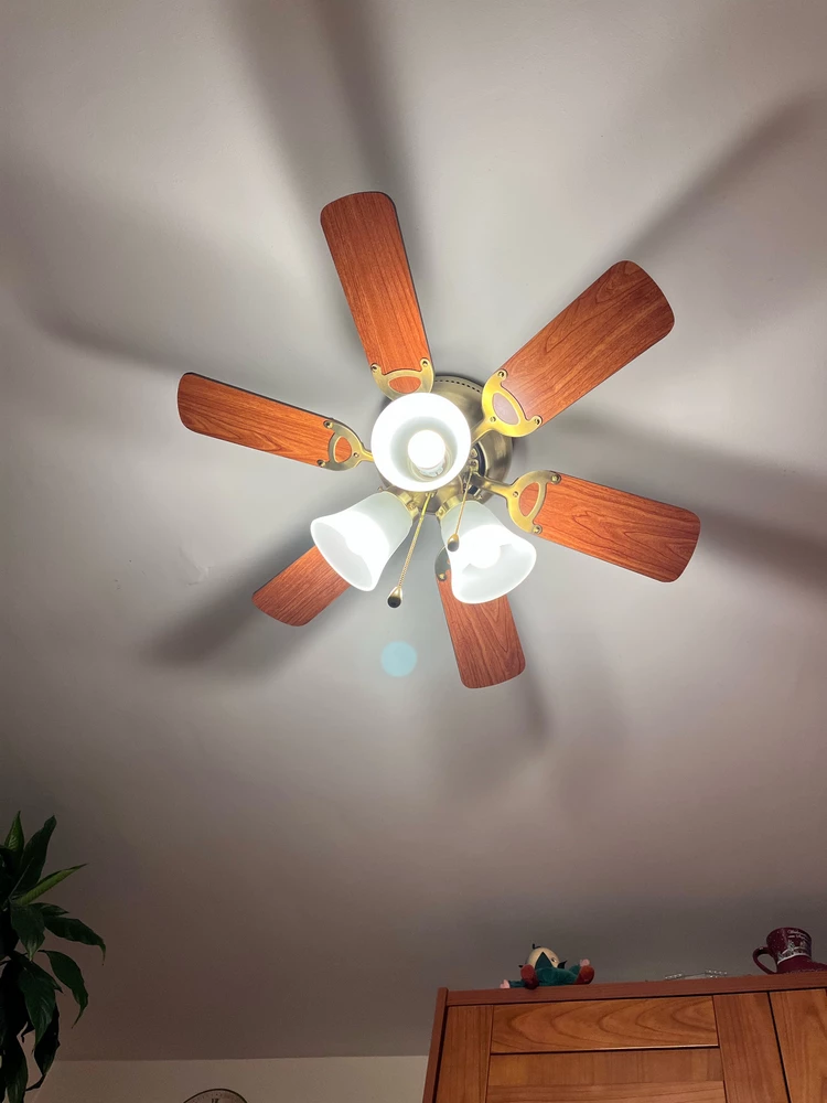 Люстра вентилятор очень понравилась, несколько режимов вентилятора, на первой скорости практически бесшумен, для небольшой комнаты заменяет кондиционер.