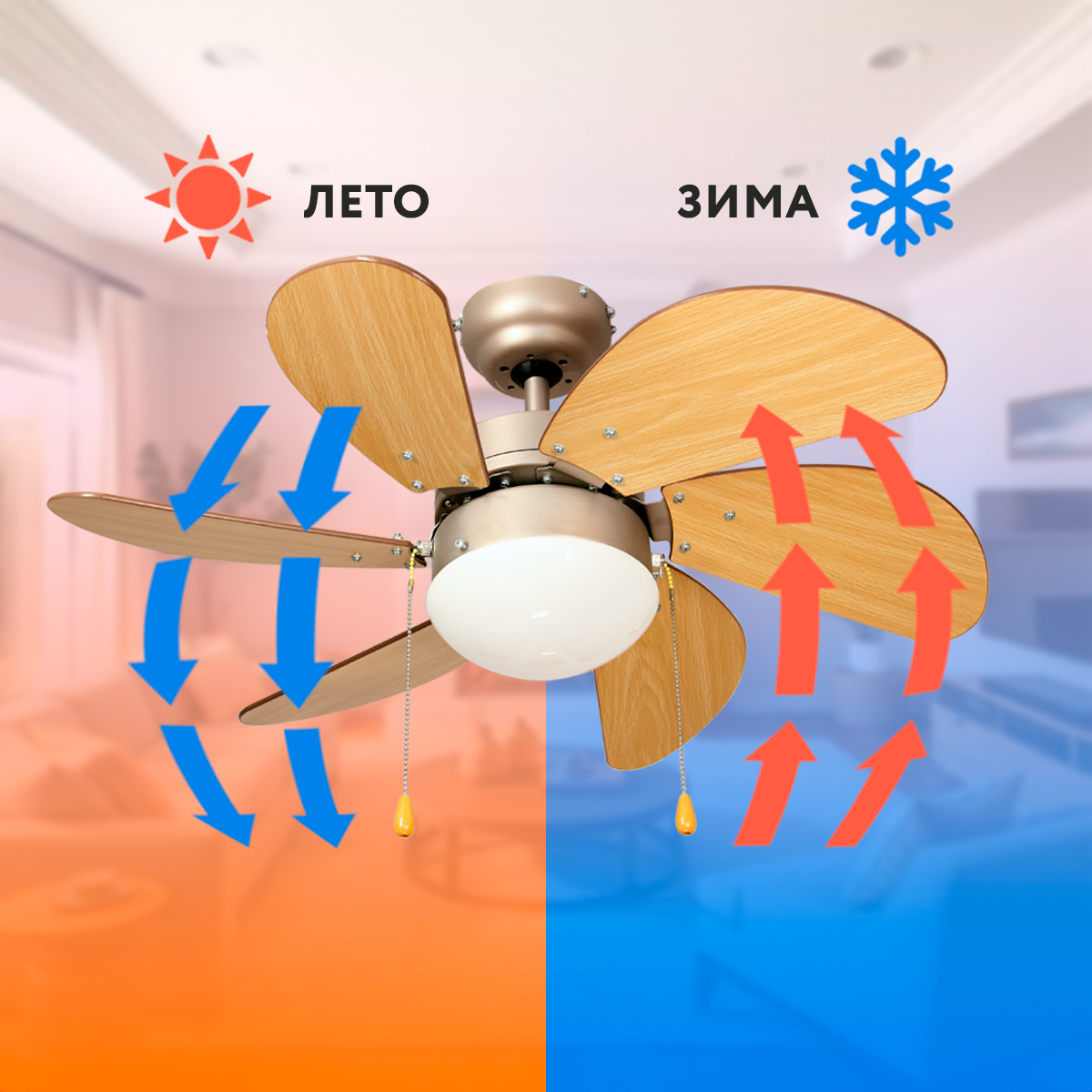 - Летний режим: для эффекта охлаждения переключите вращение двигателя против часовой стрелки