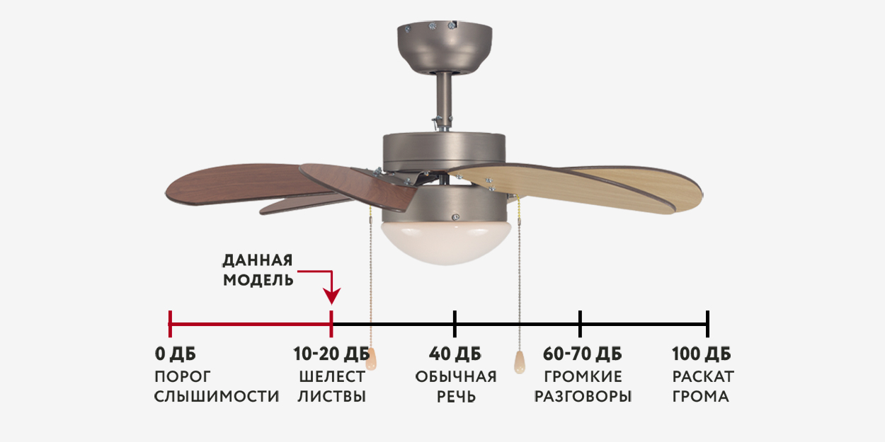 Вещь! Хотели купить кондиционер, хорошо попалась эта люстра. Минимальный режим 100 об. в минуту. В жару под одеялом холодно. Звук монотонный, низкочастотный. Можно привыкнуть. В внутри все качественно собрано, провода по 2.5 квадрата, клемники мощные, сломать трудно. Если это основное освещение патрон под лампу Е 14 лучше переделать.