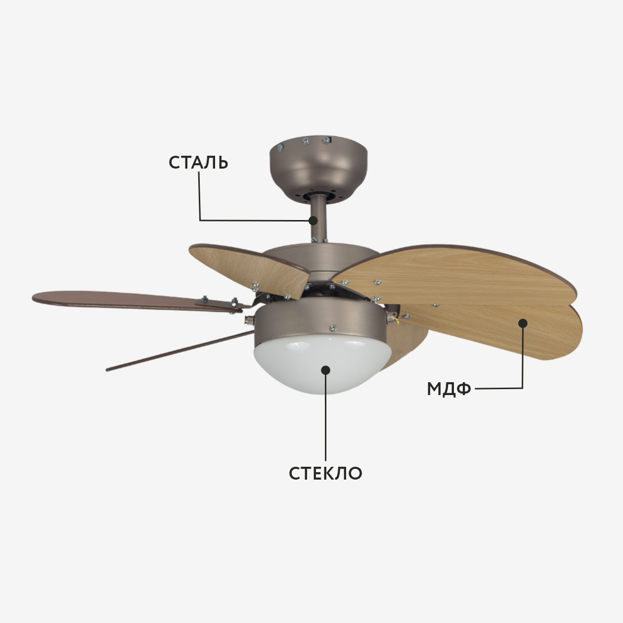 Лопасти вентилятора выполнены из клеёного влагостойкого МДФ.