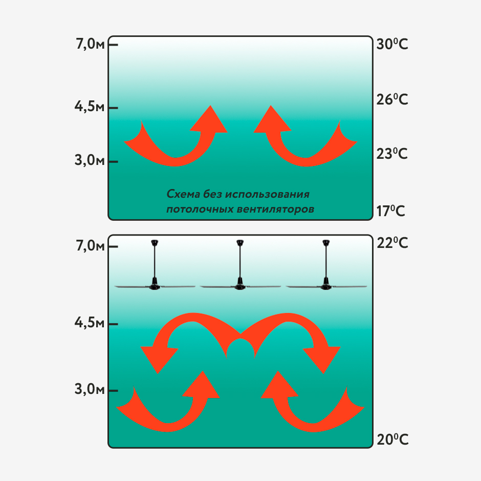 Для эффективной работы в помещении площадью от 15 до 25 м2, с высотой потолка не более 4 м, можно использовать один вентилятор.