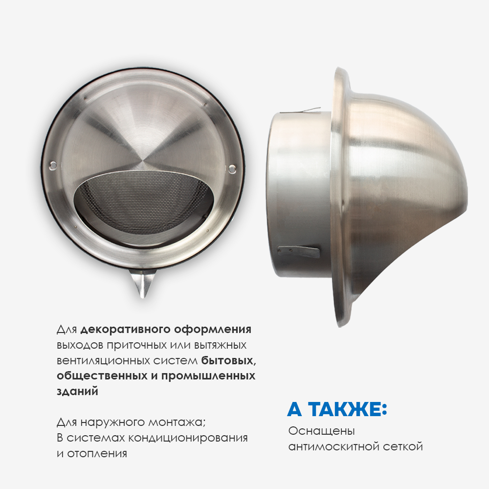 Высокопрочные металлические материалы гарантируют устойчивость к механическим воздействиям и ультрафиолету. Стенной выход с фланцем отличается простотой обслуживания — достаточно периодически очищать металлическую сетку от загрязнений.