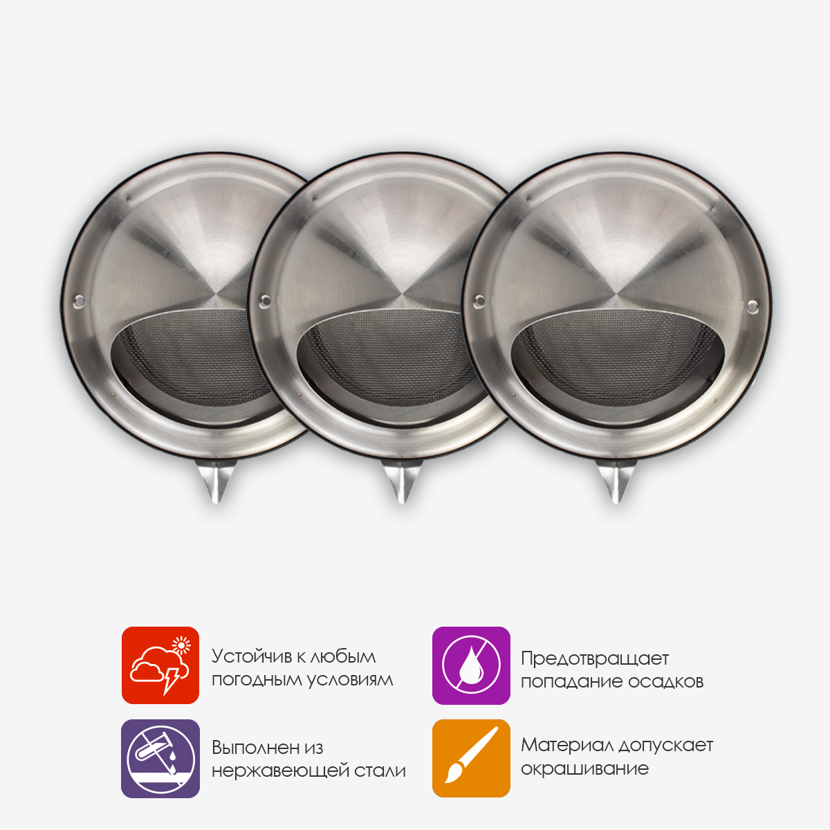 Высокопрочные металлические материалы гарантируют устойчивость к механическим воздействиям и ультрафиолету. Стенной выход с фланцем отличается простотой обслуживания — достаточно периодически очищать металлическую сетку от загрязнений.