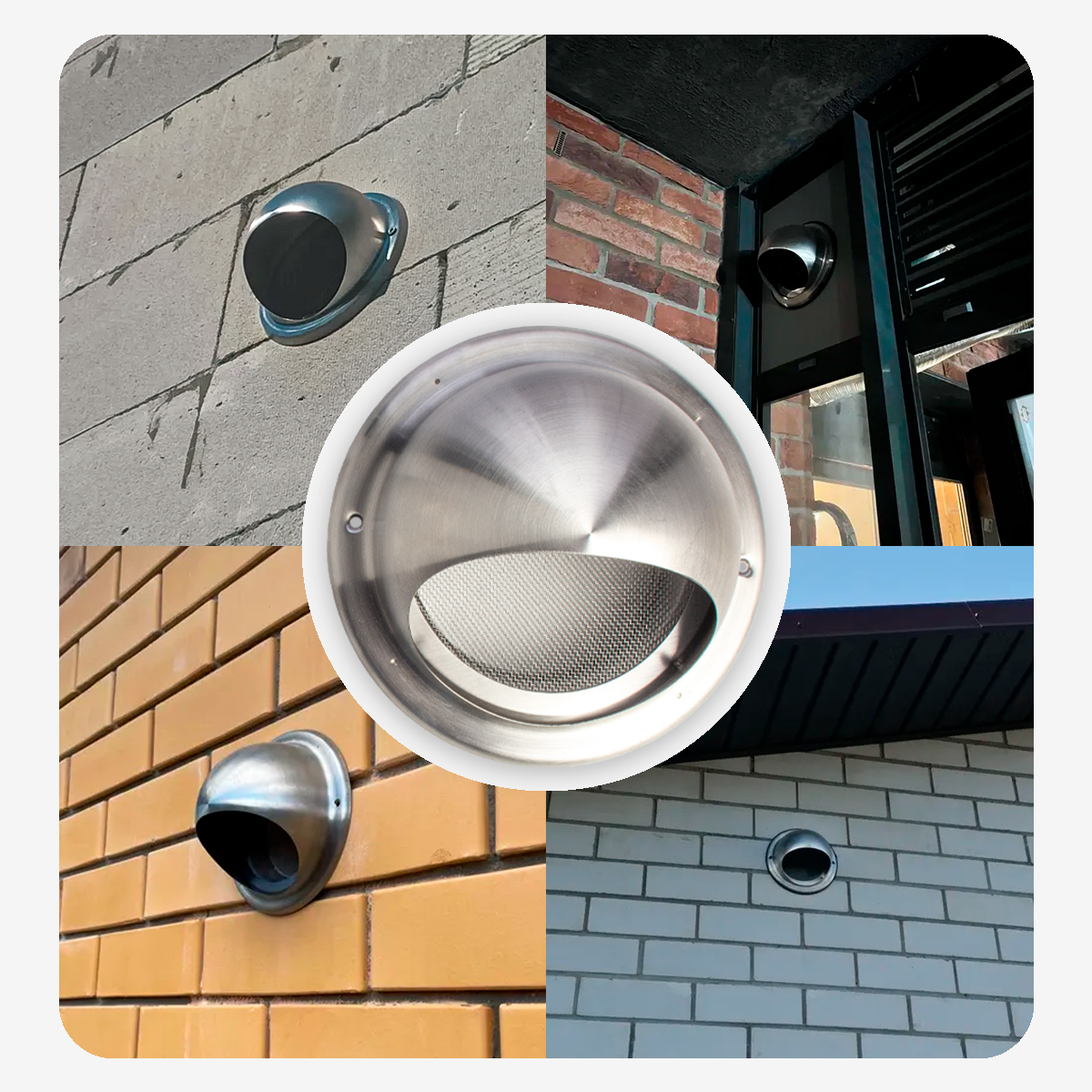 Высокопрочные металлические материалы гарантируют устойчивость к механическим воздействиям и ультрафиолету. Стенной выход с фланцем отличается простотой обслуживания — достаточно периодически очищать металлическую сетку от загрязнений.