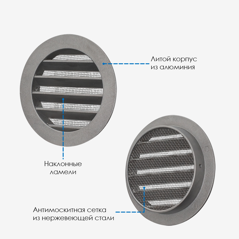 Решетка вентиляционная изготовлена из алюминия. Изделие осуществляет приток и вытяжку через предусмотренные в конструкции наклонные ламели. Так же ламели служат надежной защитой от попадания атмосферных осадков – дождя и снега. На внутренней стороне решетки предусмотрена антимоскитная сетка из нержавеющей стали. Такое сочетание материалов делает конструкцию антивандальной и устойчивой к повреждениям.