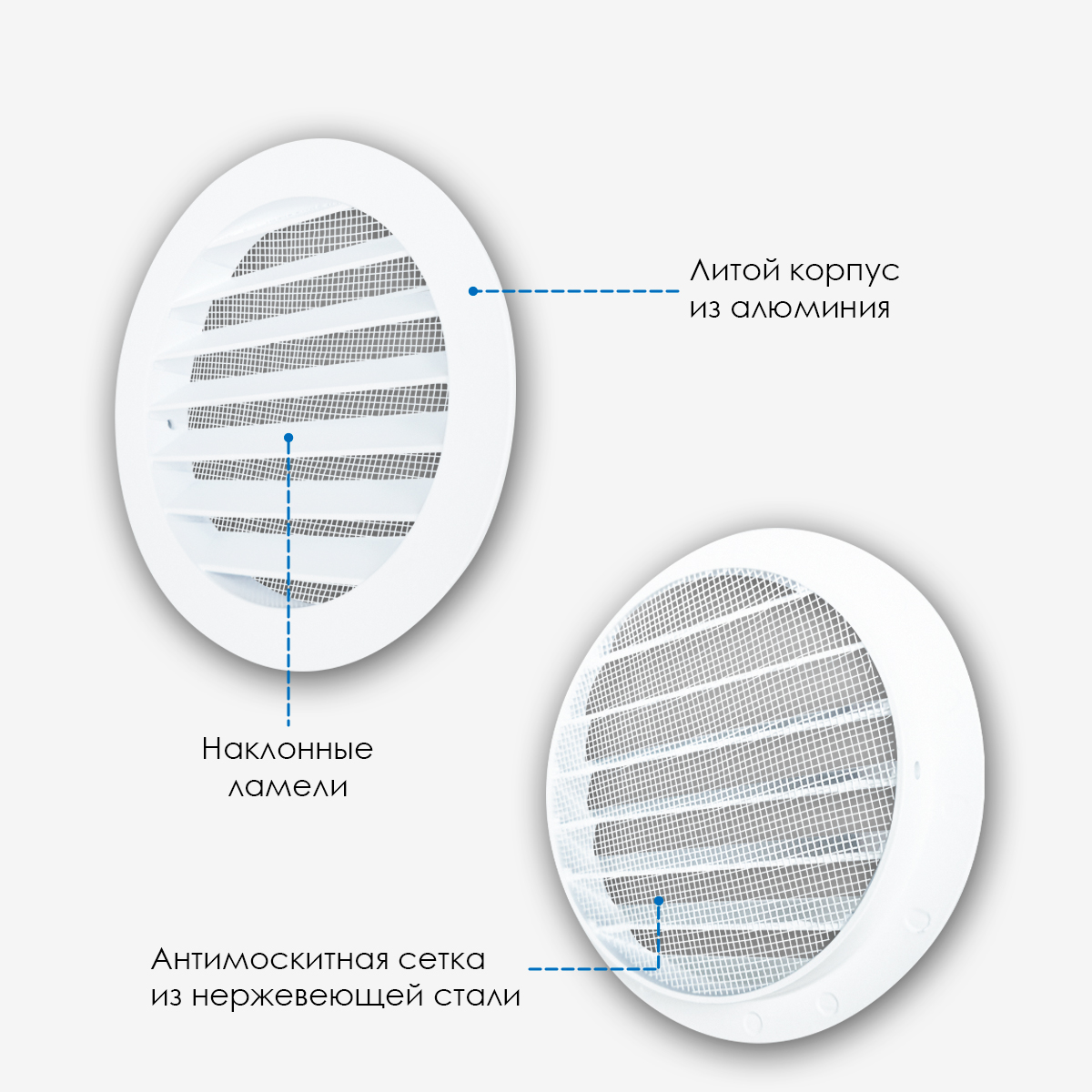 Решетка вентиляционная изготовлена из алюминия. Изделие осуществляет приток и вытяжку через предусмотренные в конструкции наклонные ламели. Так же ламели служат надежной защитой от попадания атмосферных осадков – дождя и снега. На внутренней стороне решетки предусмотрена антимоскитная сетка из нержавеющей стали. Такое сочетание материалов делает конструкцию антивандальной и устойчивой к повреждениям.