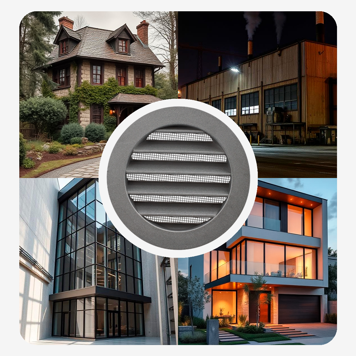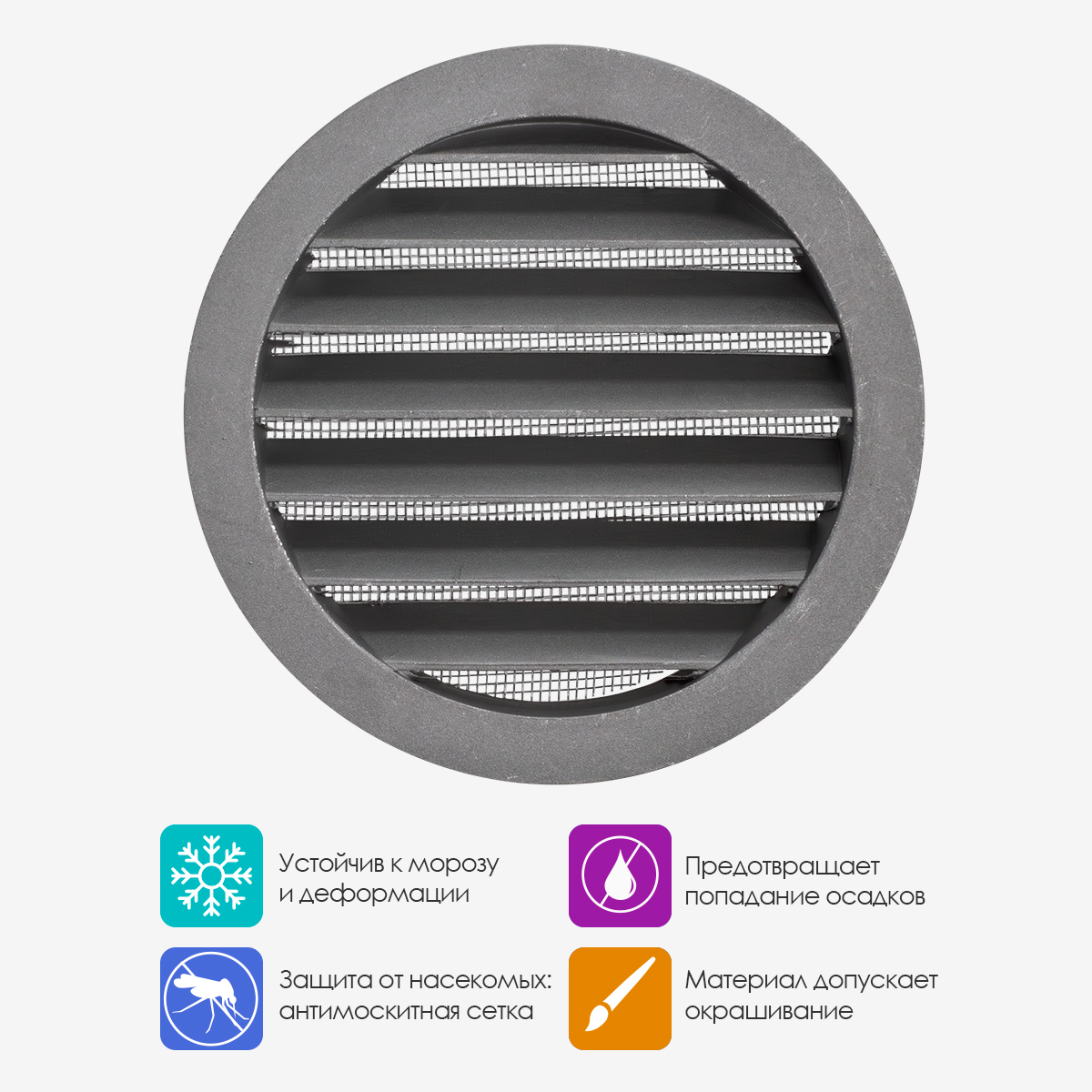 Вентиляционные решетки 160 мм характеризуются универсальностью применения: их используют для наружной вентиляции, вытяжки, а также приточных систем. Круглая форма позволяет легко интегрировать изделие в современные архитектурные решения, минимизируя сопротивление воздушному потоку. Серый цвет металлической вентиляционной решетки обеспечивает нейтральный внешний вид, гармонирующий с большинством фасадов и интерьерных решений.